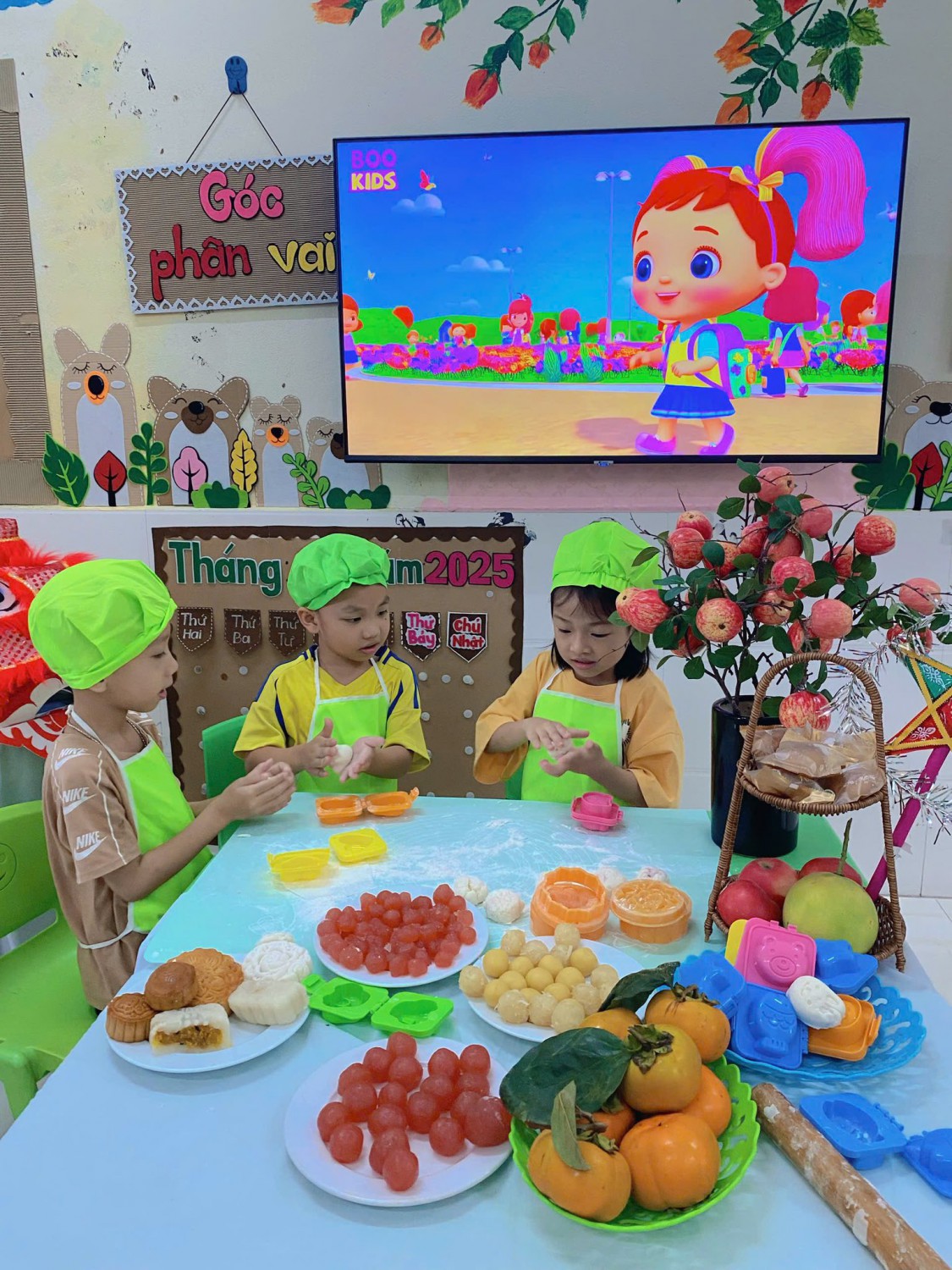 Dưới sự hướng dẫn của cô giáo, các bé được tìm hiểu về nguyên liệu, cách nhào bột, nặn khuôn và trang trí những chiếc bánh nhỏ xinh. Từng thao tác tuy còn vụng về nhưng tràn đầy niềm vui và háo hức.