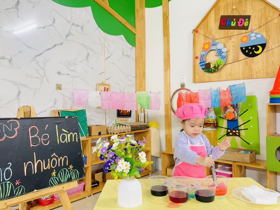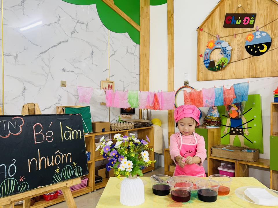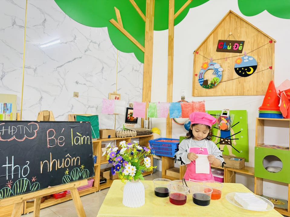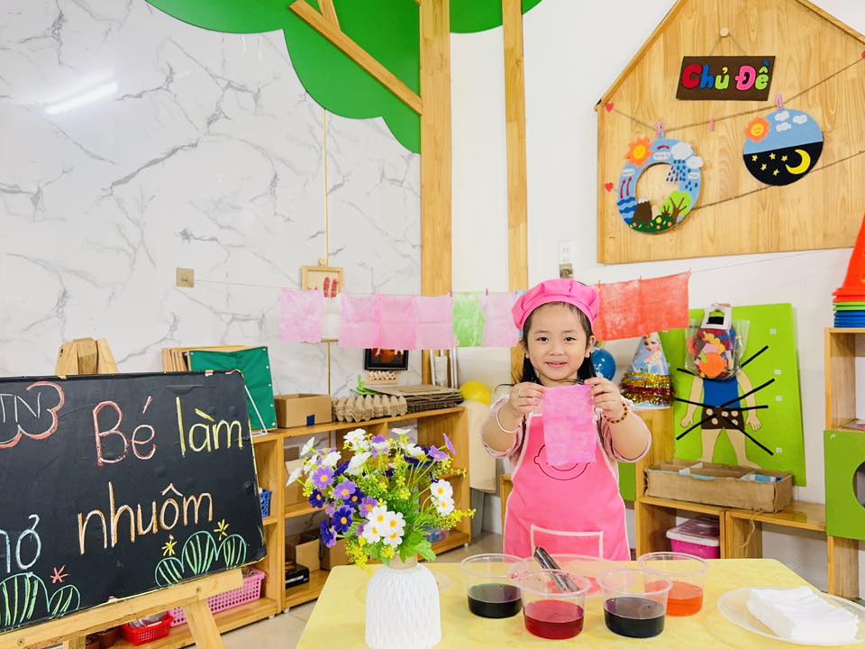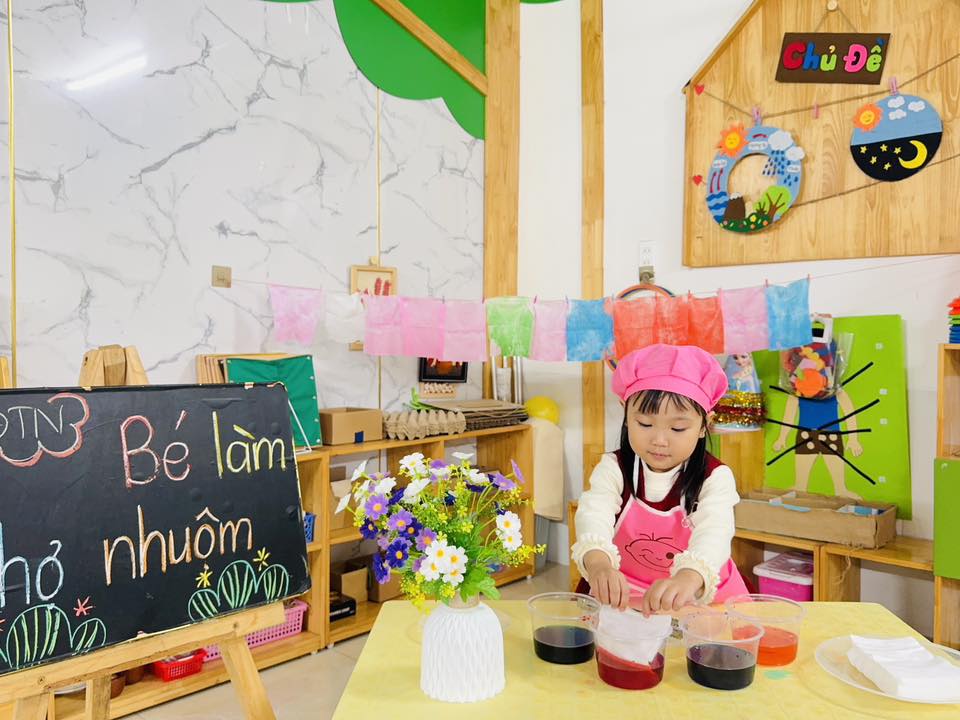 Các con được tự tay thực hành nhuộm màu, khám phá sự kỳ diệu của những sắc màu rực rỡ qua từng thao tác khéo léo.