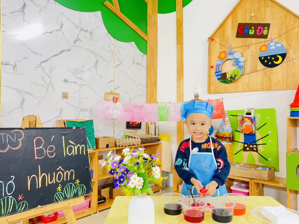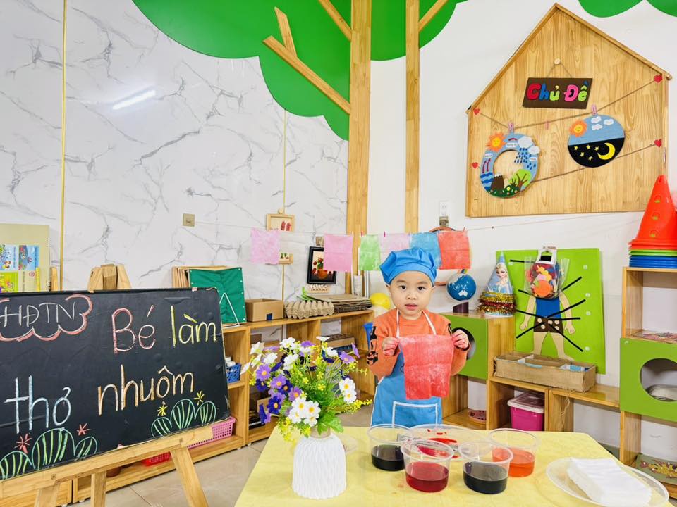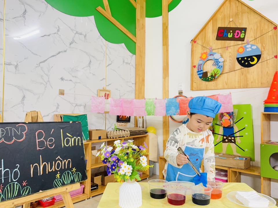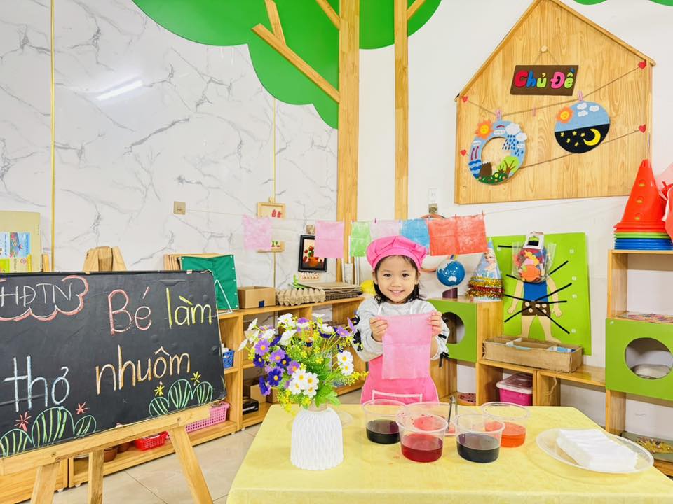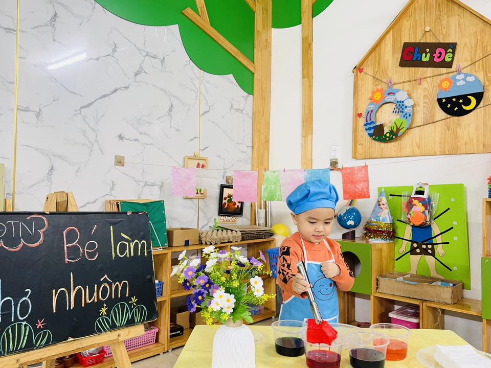 Các con được tự tay thực hành nhuộm màu, khám phá sự kỳ diệu của những sắc màu rực rỡ qua từng thao tác khéo léo.