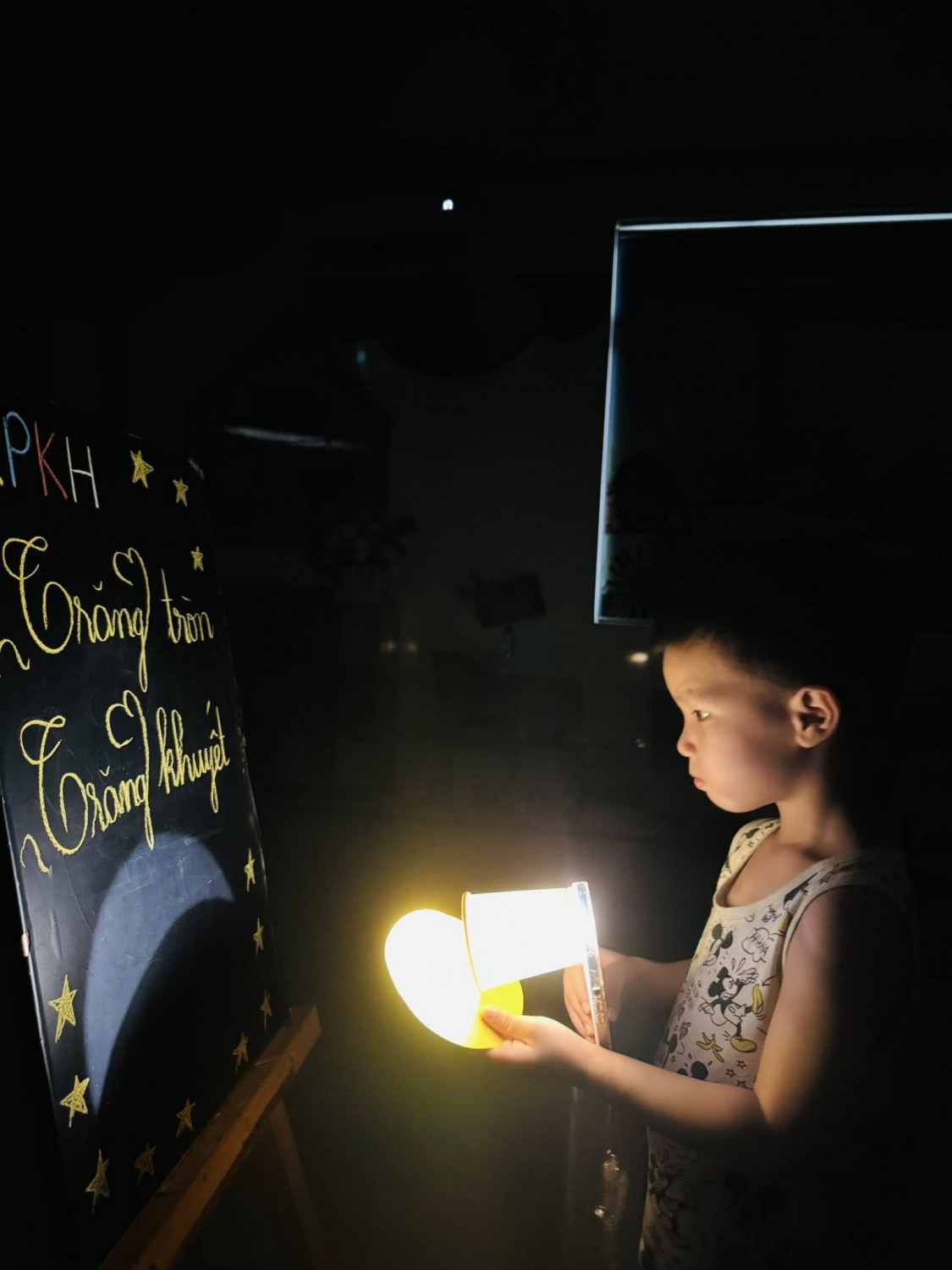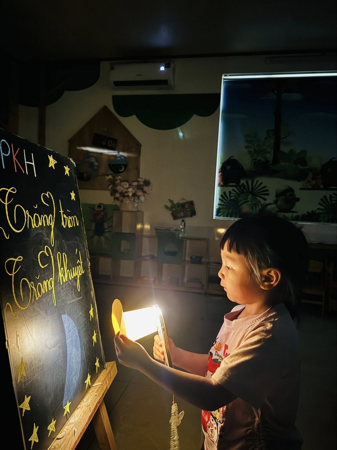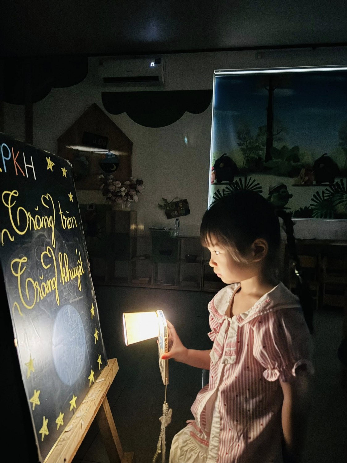 Trải nghiệm mô phỏng hiện tượng trăng tròn – trăng khuyết bằng đèn pin và quả cầu, giúp các con hiểu rõ hơn mối quan hệ giữa Mặt Trăng – Trái Đất – Mặt Trời.