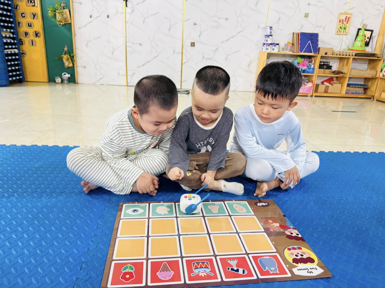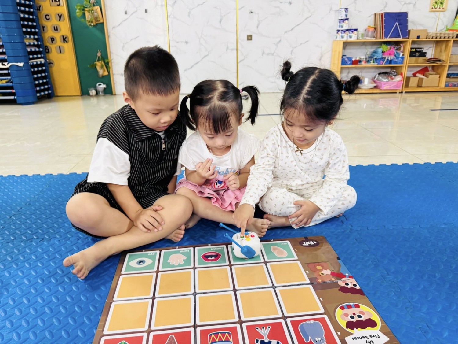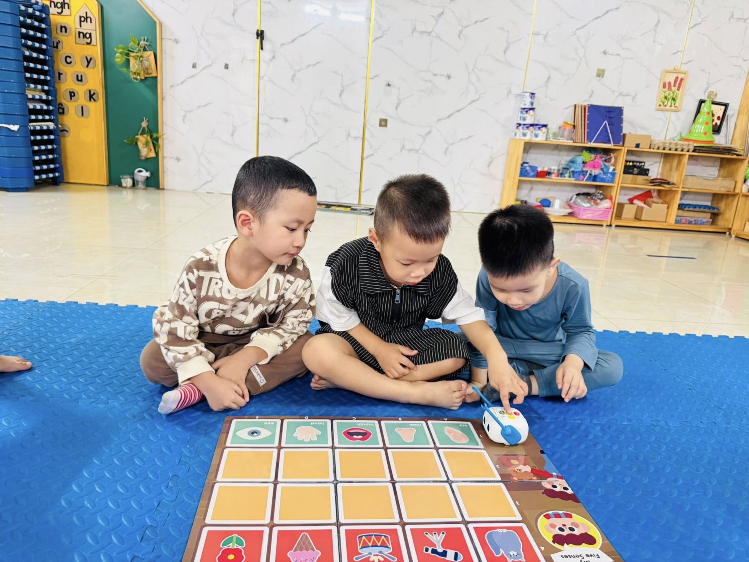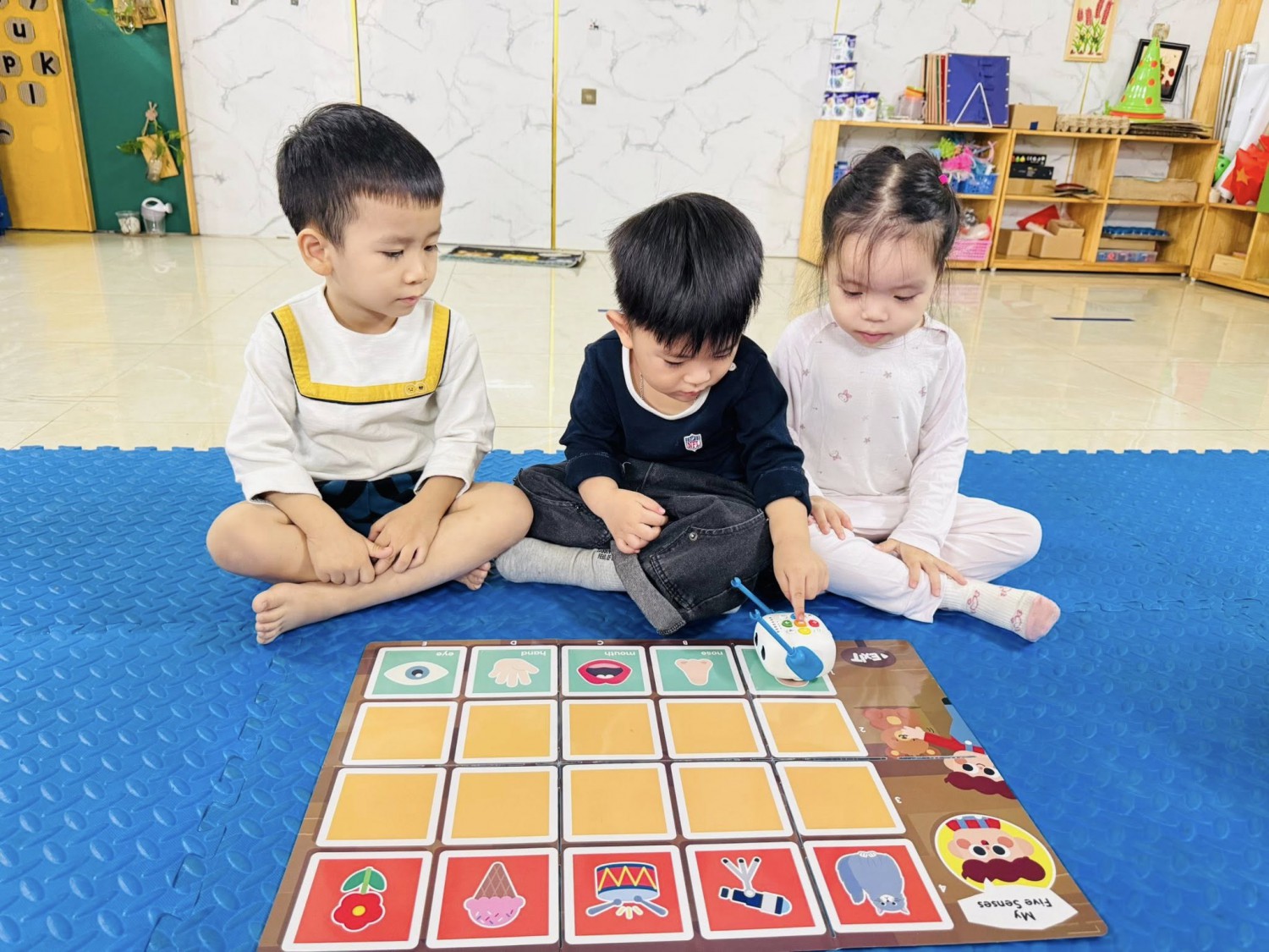 Hôm nay, các bạn nhỏ lớp Mẫu giáo 4-5 tuổi Chất lượng cao Sunny đã có một giờ học thật đặc biệt với chủ đề “My Five Senses – Năm giác quan của bé” 🧠💡Thông qua bộ thảm học lập trình, các con được tìm hiểu về năm giác quan của con người: mắt, tai, mũi, miệng và tay. Mỗi giác quan mang đến cho chúng ta những cảm nhận tuyệt vời về thế giới xung quanh — mắt để nhìn, tai để nghe, mũi để ngửi, miệng để nếm và tay để chạm. 🌍✨