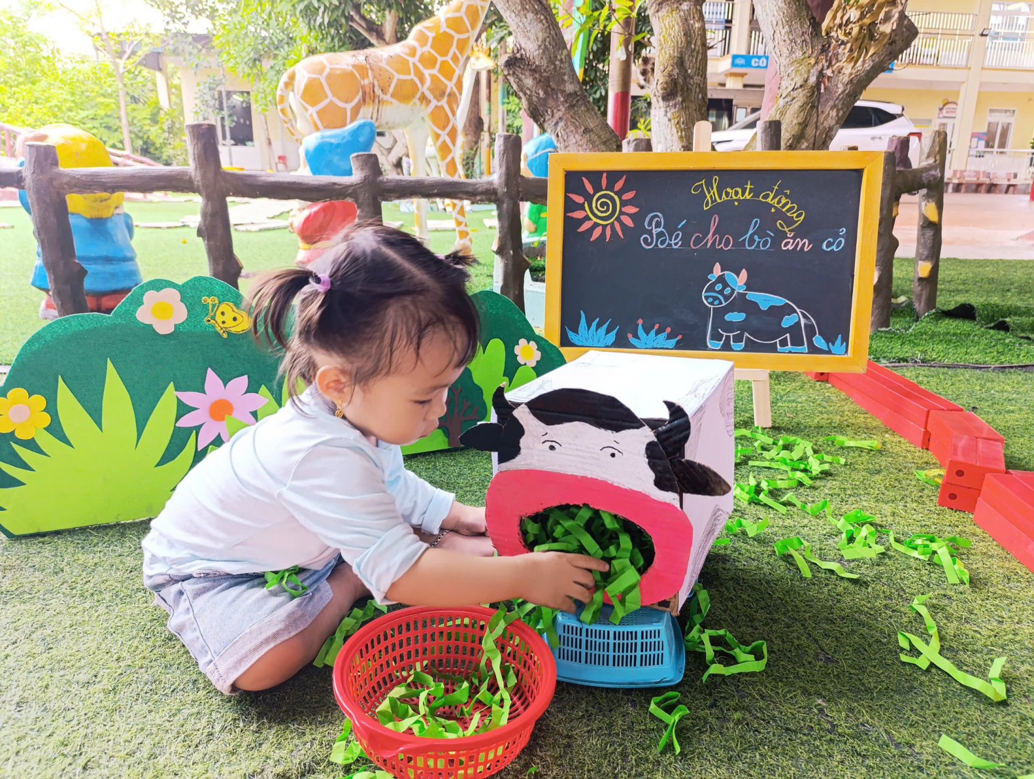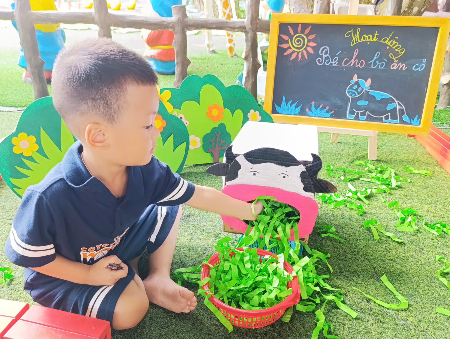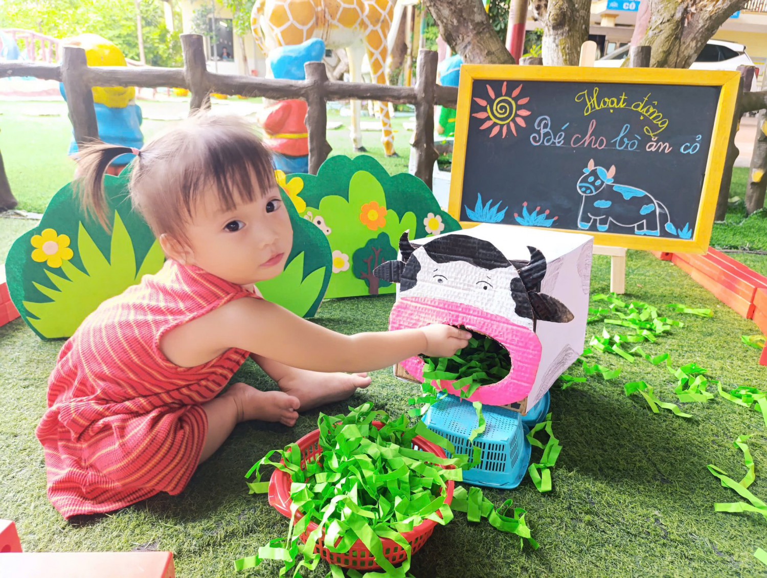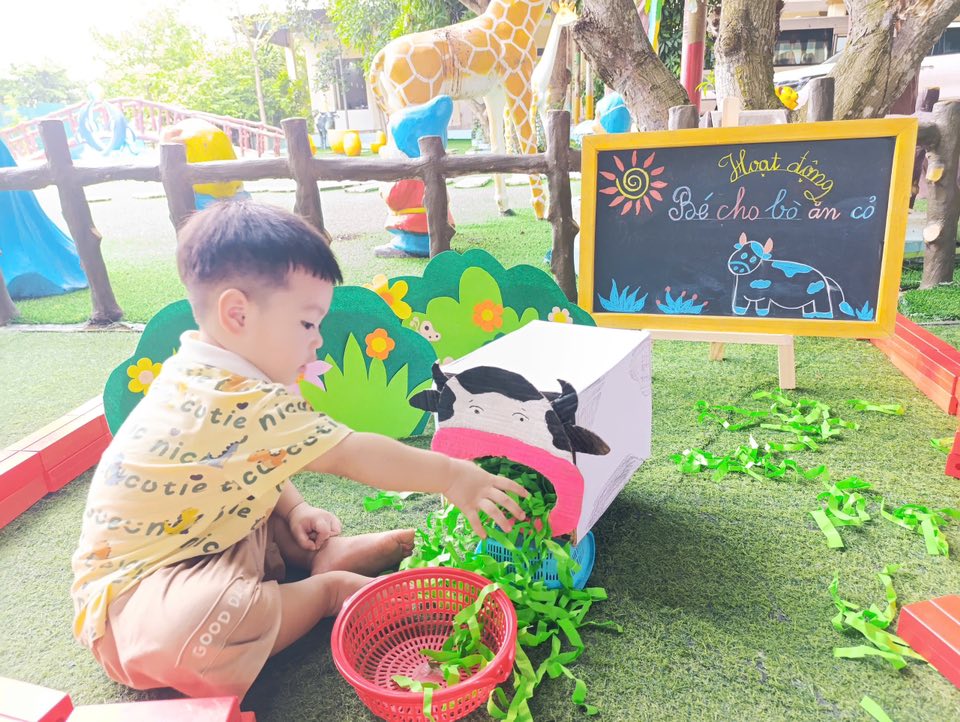 Hôm nay, các bạn nhỏ lớp Chất lượng cao Happy đã có trải nghiệm thú vị với hoạt động: “Bé cho bò ăn cỏ”.