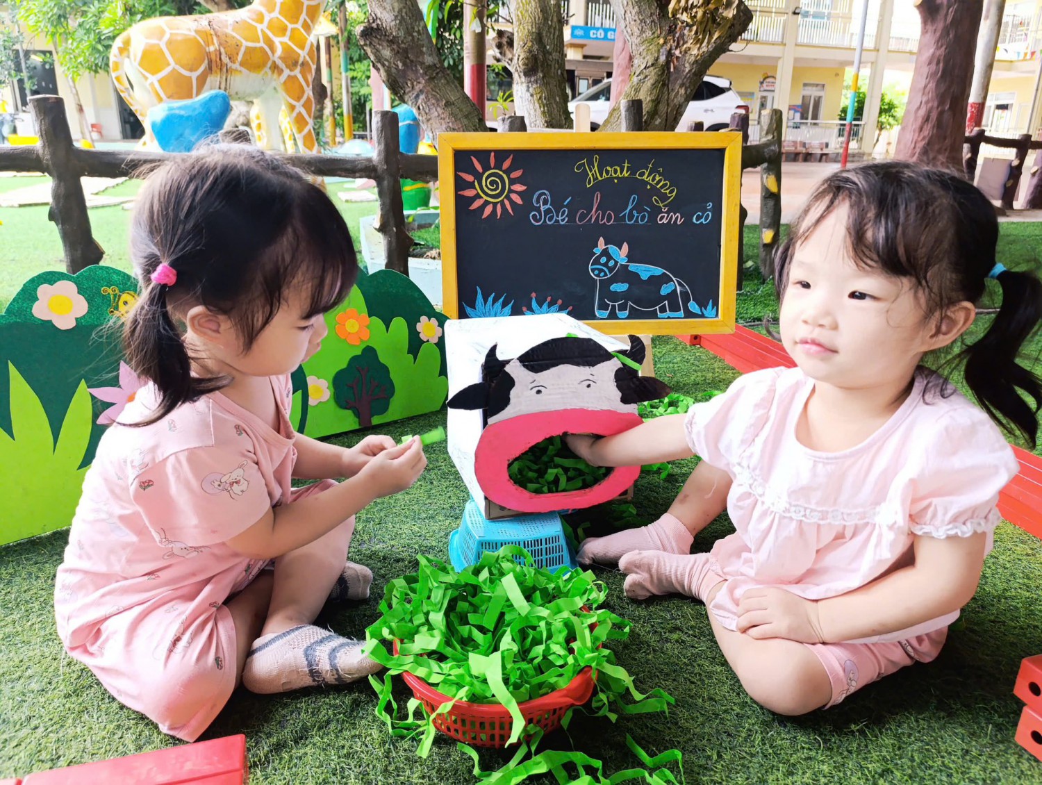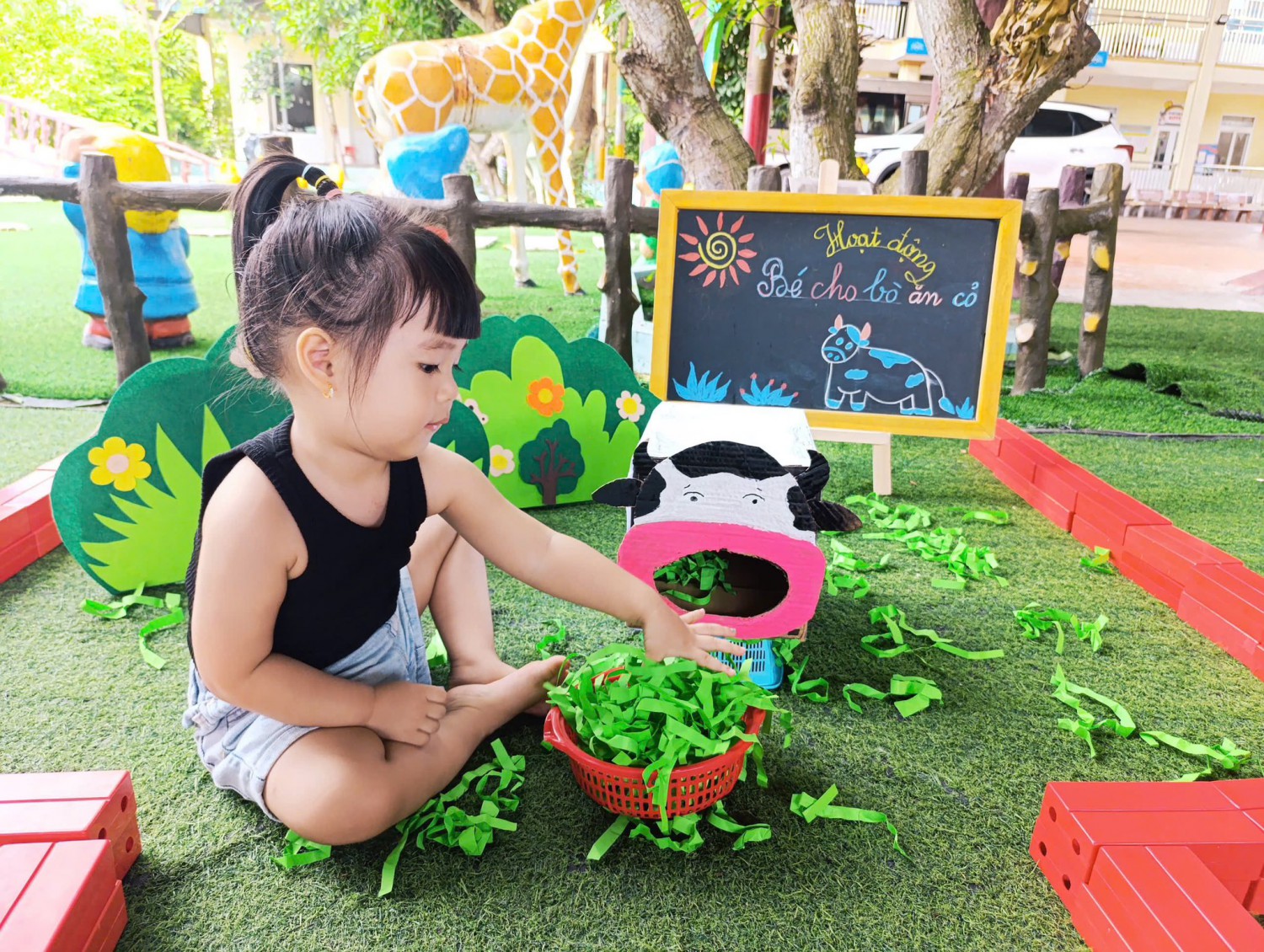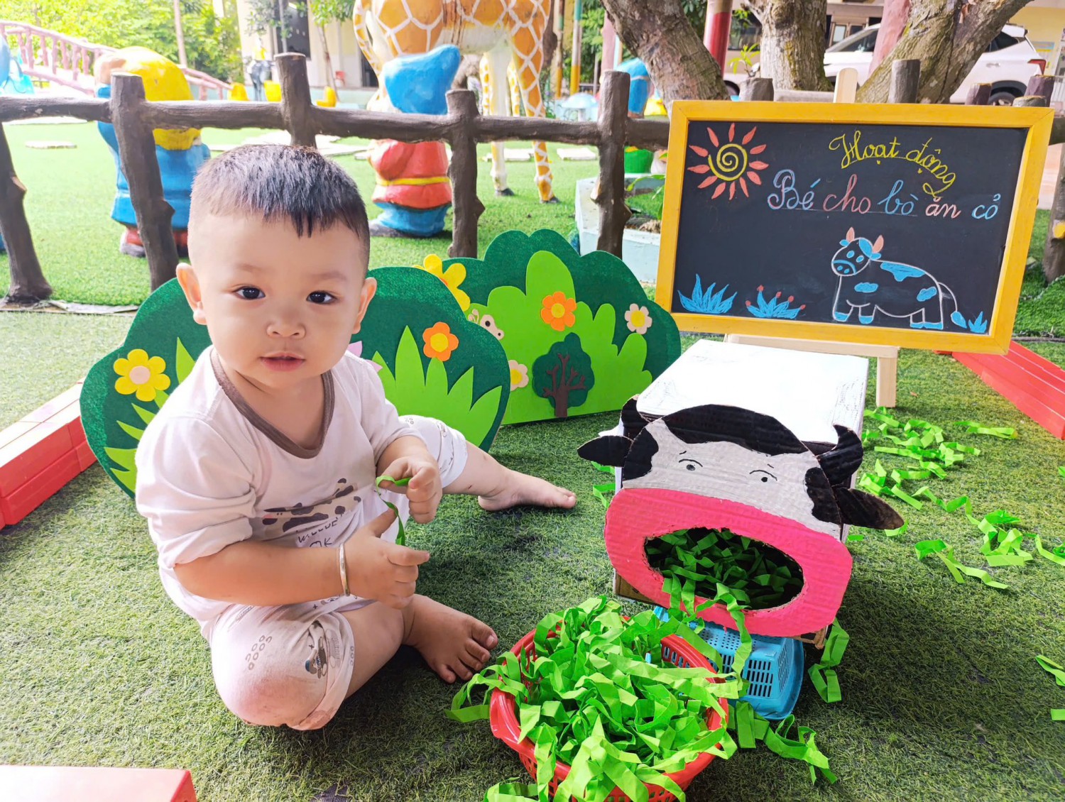 Hôm nay, các bạn nhỏ lớp Chất lượng cao Happy đã có trải nghiệm thú vị với hoạt động: “Bé cho bò ăn cỏ”.