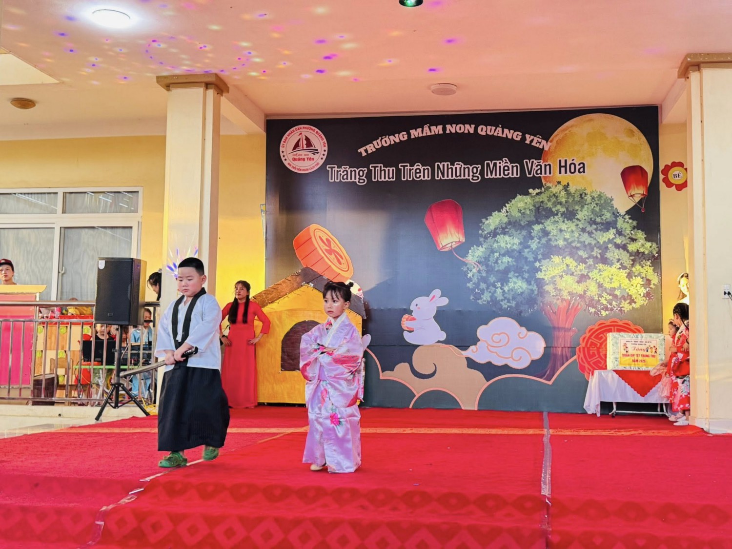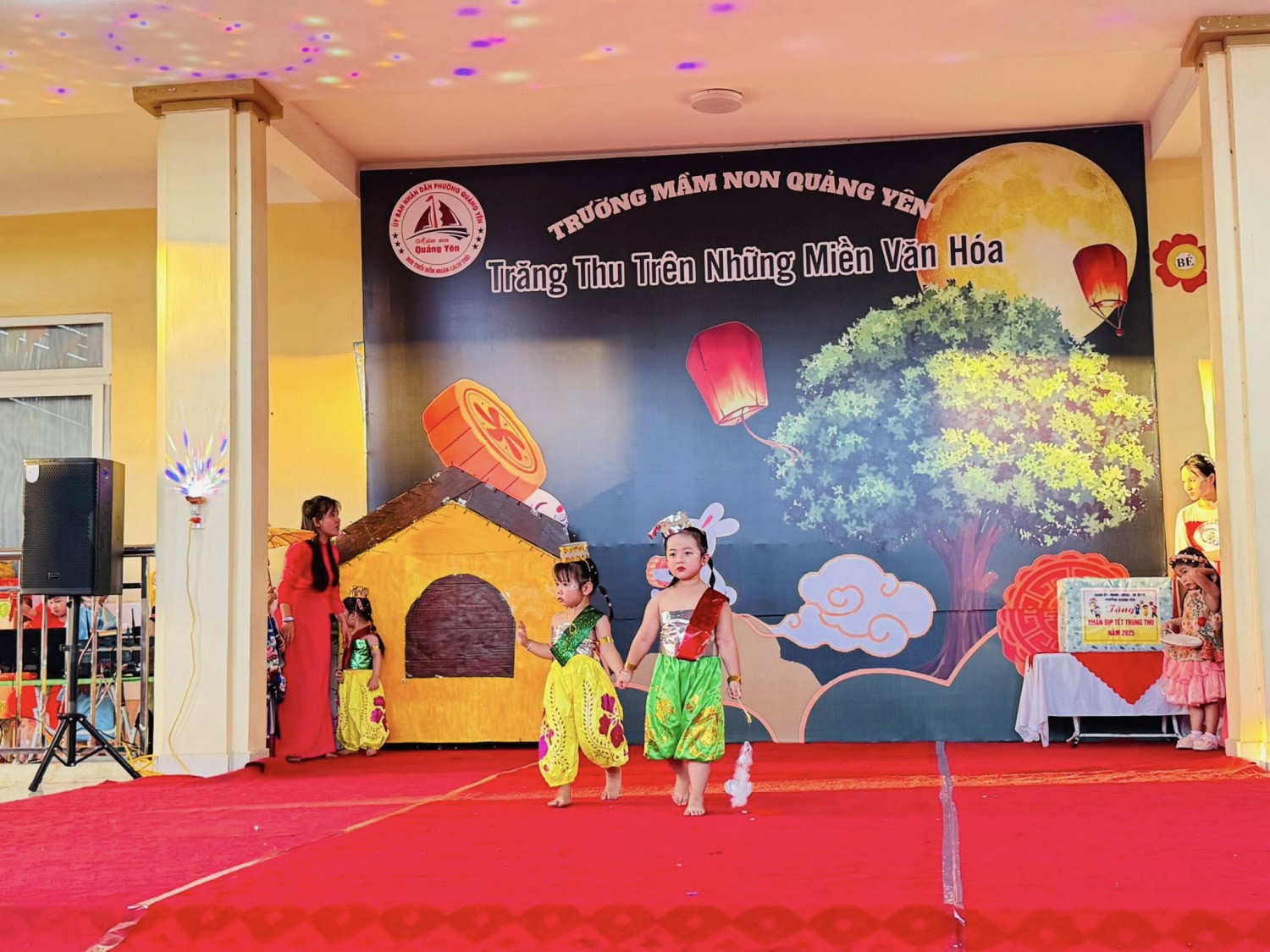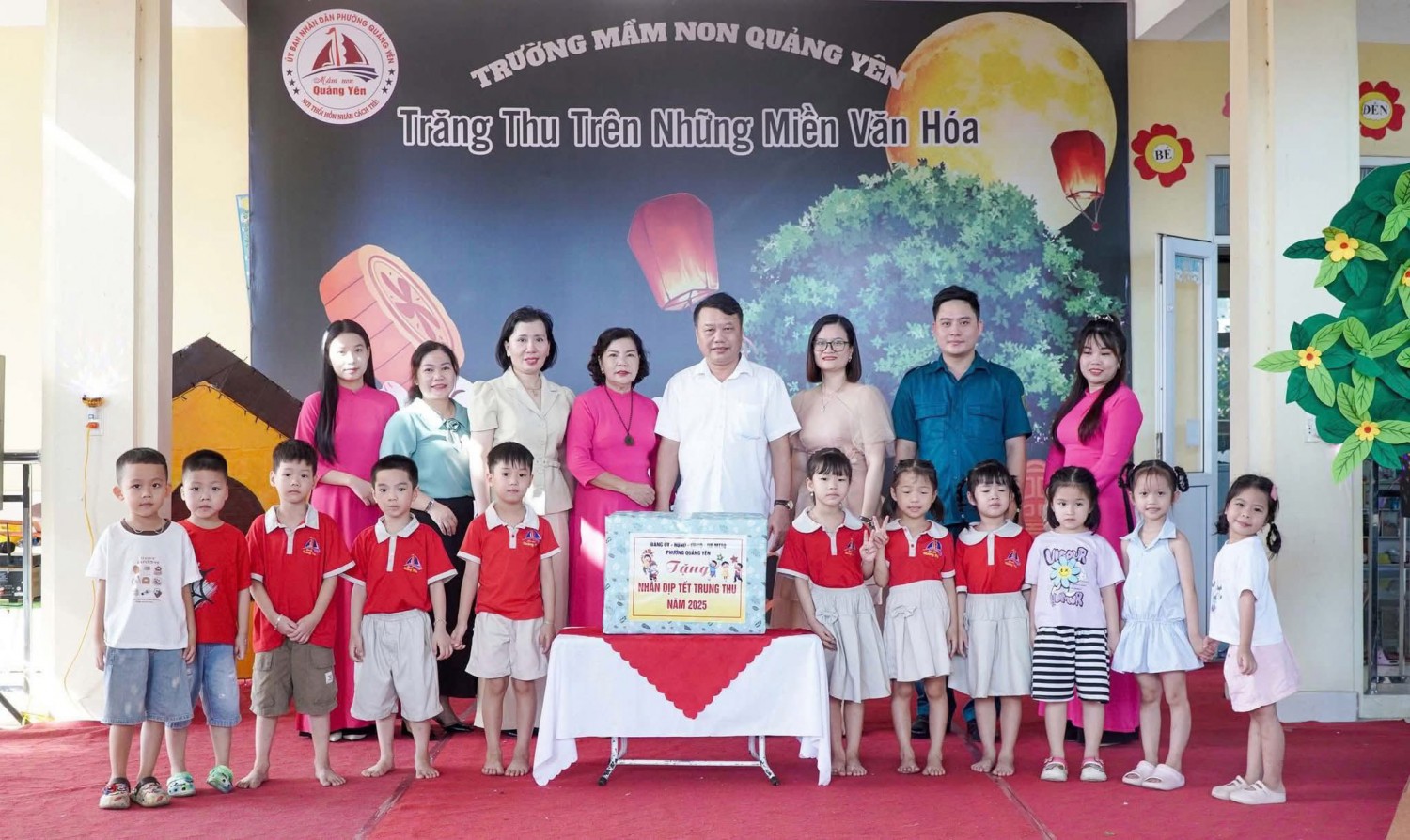 Trong ánh trăng rằm tháng tám, tiếng trống múa lân rộn ràng, tiếng cười giòn tan của trẻ thơ hòa cùng sắc màu rực rỡ của những chiếc đèn lồng, chiều ngày 03/10/2025, Trường Mầm non Quảng Yên long trọng tổ chức chương trình Trung thu với chủ đề:🌸 “Trăng Thu Trên Những Miền Văn Hoá” 🌸mang đến cho các bé một hành trình khám phá vừa lung linh, vừa đậm đà giá trị truyền thống.💐 Đặc biệt, nhà trường vô cùng vinh dự được đón tiếp Ban lãnh đạo đại diện Đảng ủy – HĐND – UBND – UB MTTQ phường Quảng Yên đến thăm và trao tặng những phần quà ý nghĩa cho các cháu. Những món quà không chỉ là sự sẻ chia vật chất, mà còn là tình cảm, sự quan tâm sâu sắc của lãnh đạo địa phương dành cho thế hệ mầm non – những chủ nhân tương lai của đất nước.🎉 Trung thu năm nay tại Trường Mầm non Quảng Yên trở nên thật đặc biệt với nhiều hoạt động phong phú và hấp dẫn:✨ Những tiết mục Nhạc kịch và Trình diễn thời trang tái hiện nét đẹp văn hoá của đất nước Việt Nam – Nhật Bản – Thái Lan, đưa các bé “Du hành” qua nhiều miền văn hóa rực rỡ.✨ Phần thi năng khiếu của các bạn khối 5 tuổi bùng nổ tài năng, sự tự tin và sáng tạo: Múa quạt, nhảy hiện đại, vẽ ✨ Màn múa Lân tưng bừng, sôi động, khơi dậy không khí Trung thu truyền thống.✨ Hoạt động trải nghiệm dưới sân khấu có sự tham gia của bố mẹ cùng các con, tạo nên những giây phút gắn kết ấm áp, để lại trong lòng các bé những kỷ niệm thật khó quên.