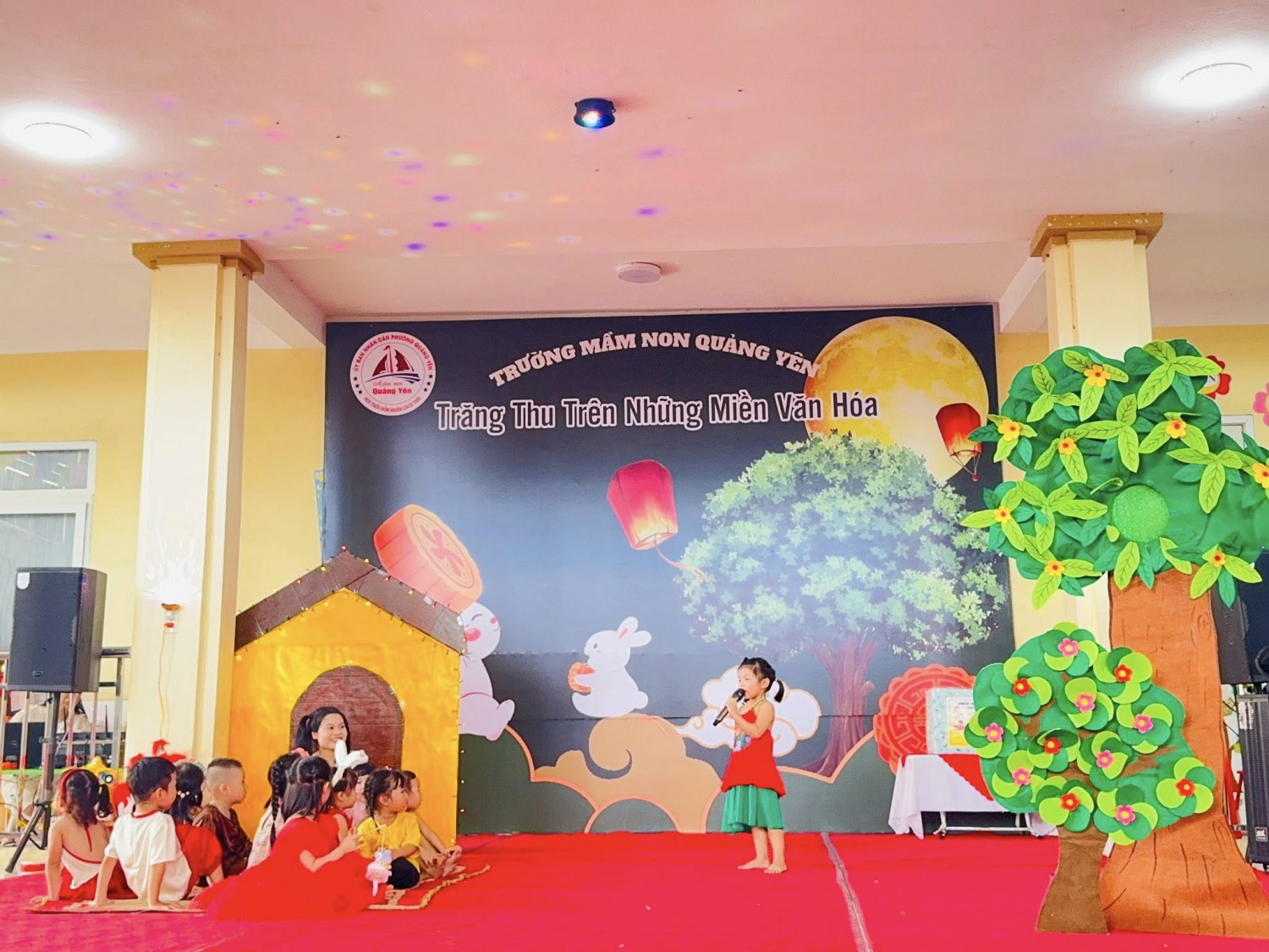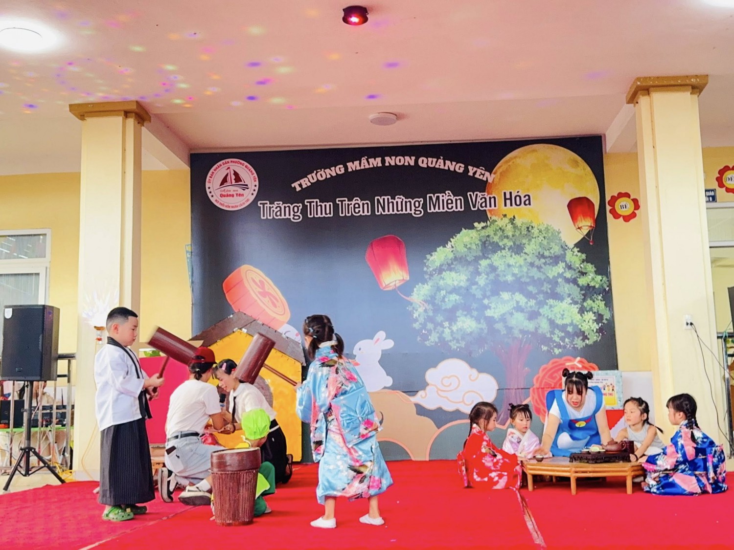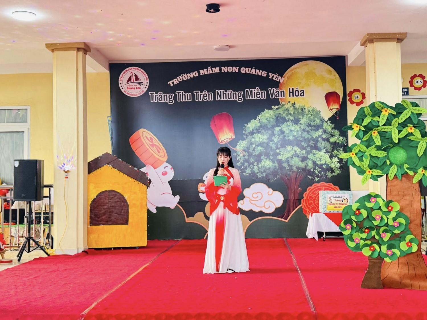 Trong ánh trăng rằm tháng tám, tiếng trống múa lân rộn ràng, tiếng cười giòn tan của trẻ thơ hòa cùng sắc màu rực rỡ của những chiếc đèn lồng, chiều ngày 03/10/2025, Trường Mầm non Quảng Yên long trọng tổ chức chương trình Trung thu với chủ đề:🌸 “Trăng Thu Trên Những Miền Văn Hoá” 🌸mang đến cho các bé một hành trình khám phá vừa lung linh, vừa đậm đà giá trị truyền thống.💐 Đặc biệt, nhà trường vô cùng vinh dự được đón tiếp Ban lãnh đạo đại diện Đảng ủy – HĐND – UBND – UB MTTQ phường Quảng Yên đến thăm và trao tặng những phần quà ý nghĩa cho các cháu. Những món quà không chỉ là sự sẻ chia vật chất, mà còn là tình cảm, sự quan tâm sâu sắc của lãnh đạo địa phương dành cho thế hệ mầm non – những chủ nhân tương lai của đất nước.🎉 Trung thu năm nay tại Trường Mầm non Quảng Yên trở nên thật đặc biệt với nhiều hoạt động phong phú và hấp dẫn:✨ Những tiết mục Nhạc kịch và Trình diễn thời trang tái hiện nét đẹp văn hoá của đất nước Việt Nam – Nhật Bản – Thái Lan, đưa các bé “Du hành” qua nhiều miền văn hóa rực rỡ.✨ Phần thi năng khiếu của các bạn khối 5 tuổi bùng nổ tài năng, sự tự tin và sáng tạo: Múa quạt, nhảy hiện đại, vẽ ✨ Màn múa Lân tưng bừng, sôi động, khơi dậy không khí Trung thu truyền thống.✨ Hoạt động trải nghiệm dưới sân khấu có sự tham gia của bố mẹ cùng các con, tạo nên những giây phút gắn kết ấm áp, để lại trong lòng các bé những kỷ niệm thật khó quên.